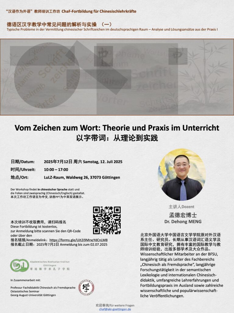 Diese eintägige Lehrerfortbildung widmet sich typischen Herausforderungen im Unterricht chinesischer Schriftzeichen im deutschsprachigen Raum. Dr. Meng stellt praxisorientierte Lösungsansätze vor, um die Verbindung zwischen Zeichen und Wörtern im Fremdsprachenunterricht effektiv zu nutzen und den Wortschatzerwerb zu fördern.