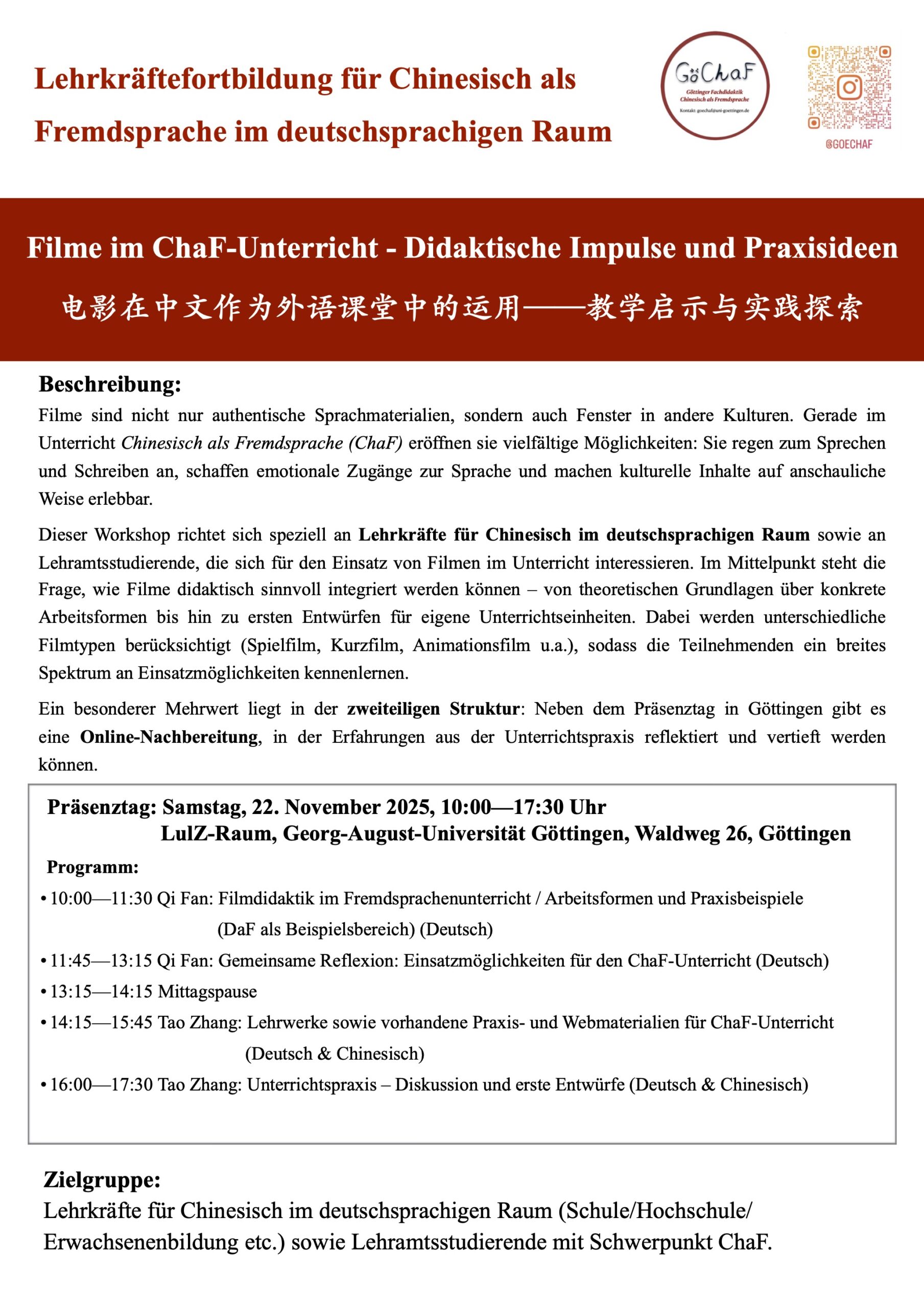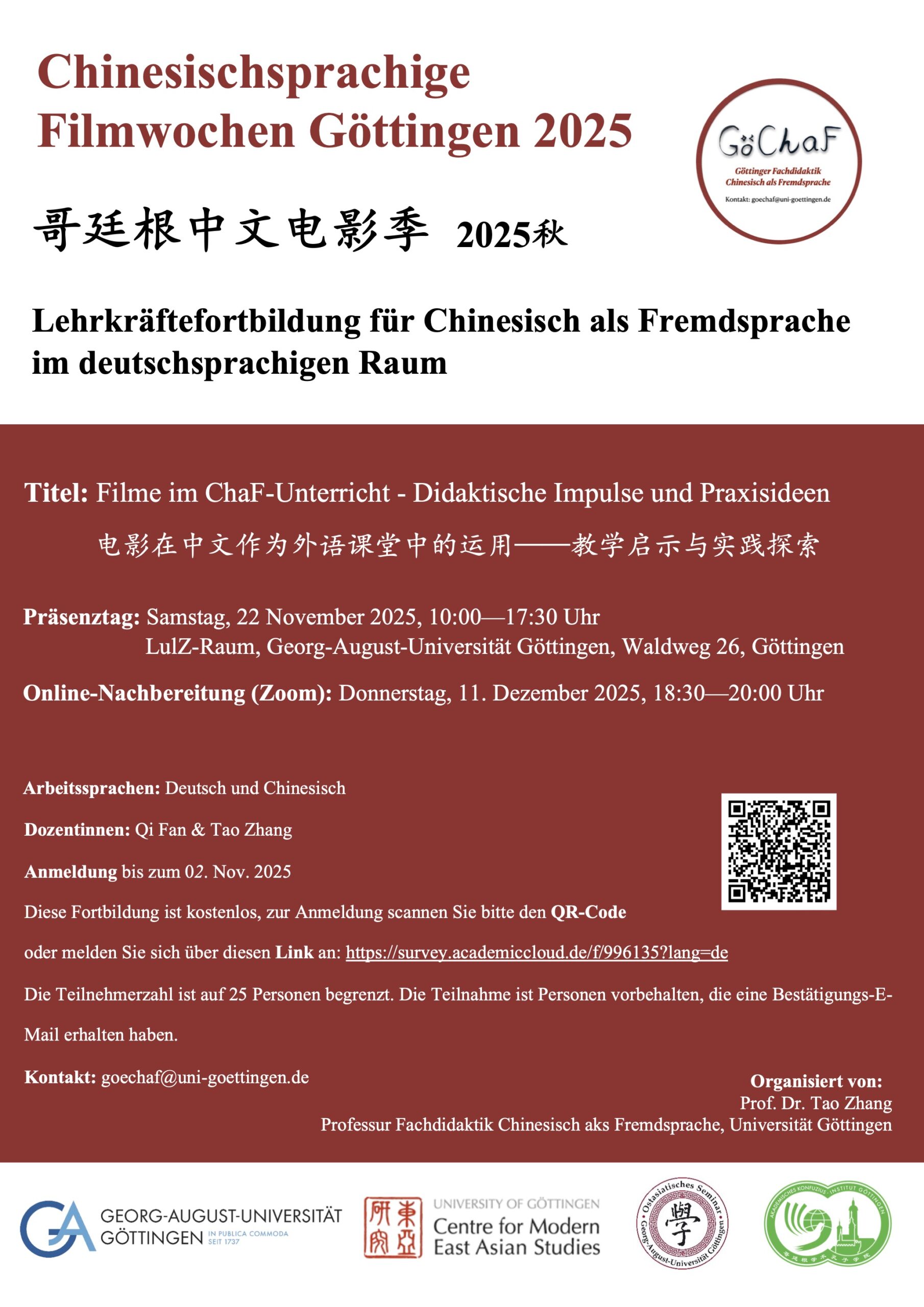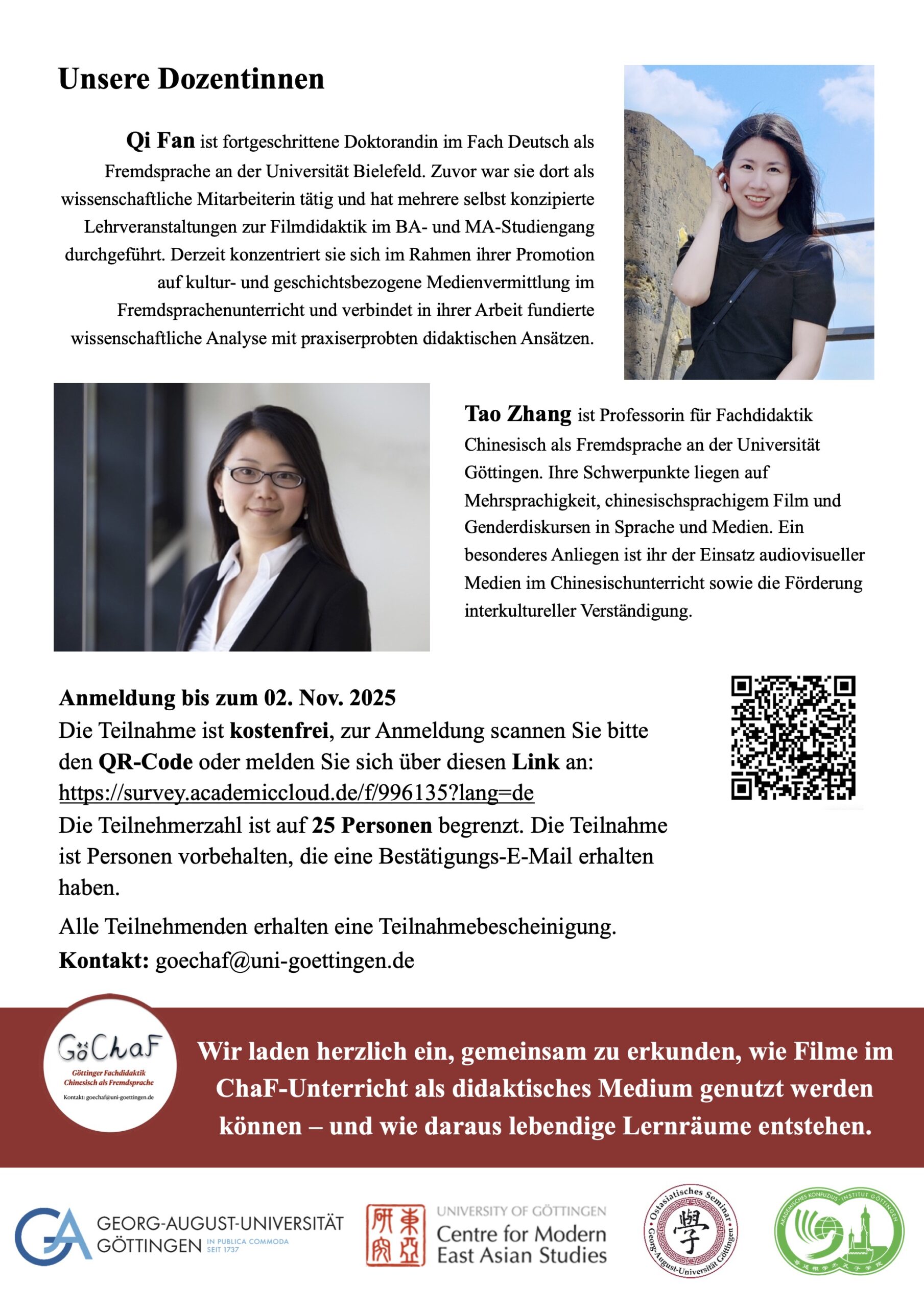 Im Rahmen der Chinesischsprachigen Filmwochen Göttingen 2025 möchten wir herzlich zur folgenden Lehrkräftefortbildung einladen: