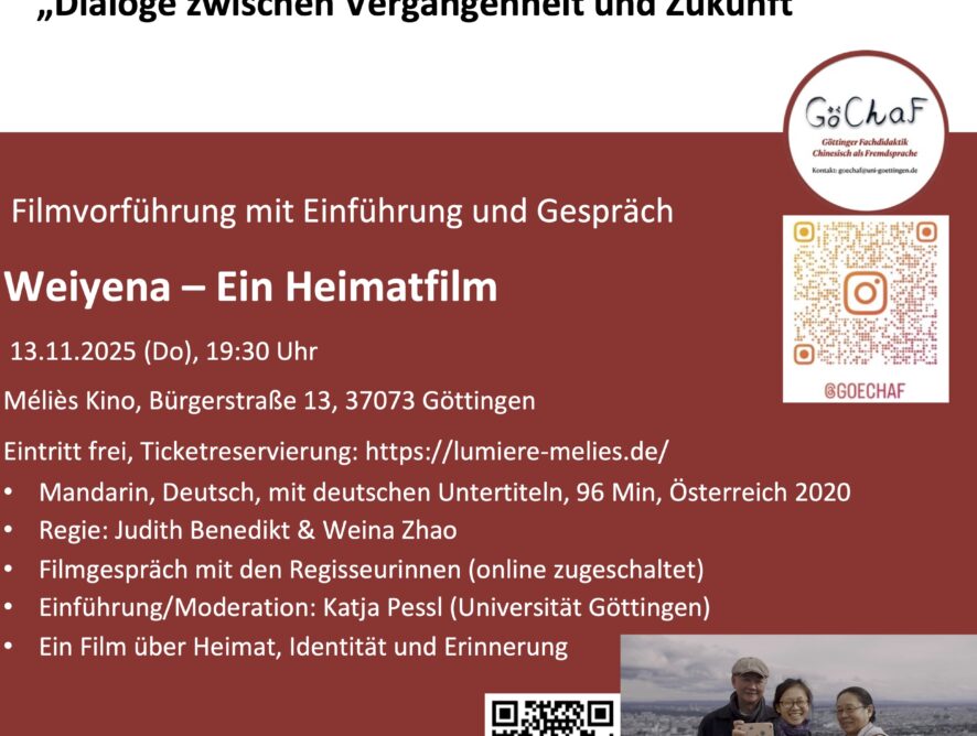 Weiyena – ein Heimatfilm 13. 11. 2025, 19:30, Méliès Kino Göttingen Mand. & Dt. m. dt. UT, 96 Minuten, Filmgespräch mit Judith Benedikt & Weina Zhao (online), Moderation: Katja Pessl (Universität Göttingen)