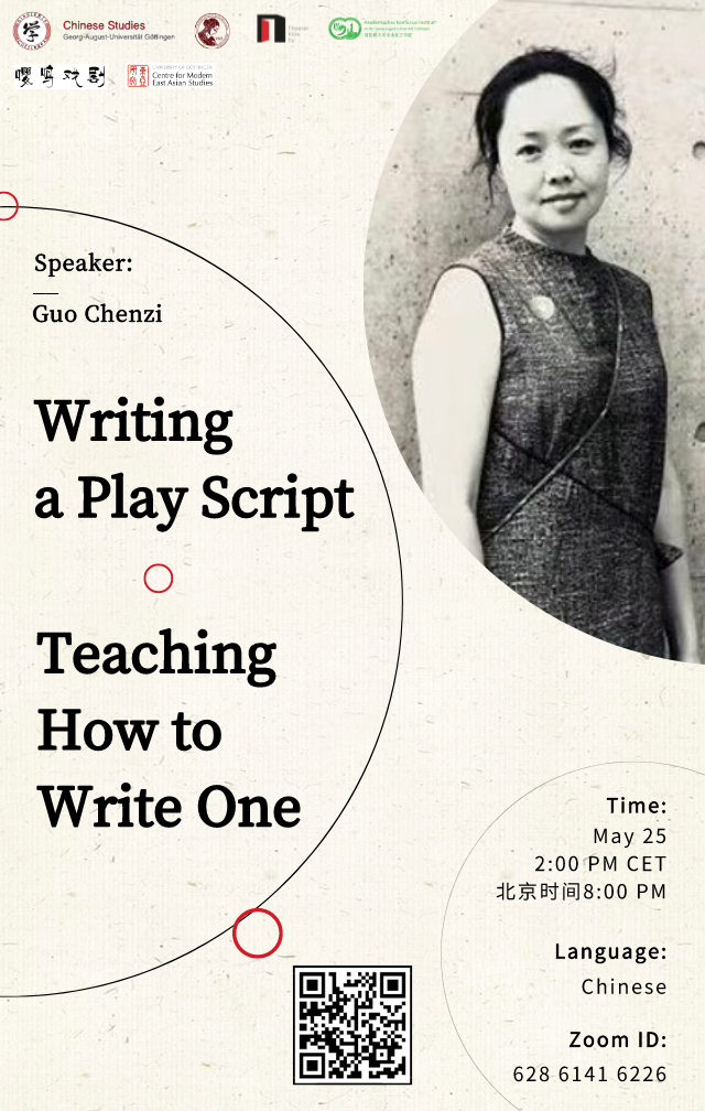 ZoomWriting a Play Script and Teaching How to Write One Guo Chenzi Time: Wednesday, May 25, 2: 00 PM CET Zoom Meeting: https://uni-goettingen.zoom.us/j/62861416226 Meeting ID: 628 6141 6226 Language: Chinese Content 1. Can we “learn” how to write a play? What are the pros and cons of playwriting “apprenticeships”? 写剧本能“学”吗? 编剧“学徒制”的利与弊。 2. Can we “teach” how to write a …