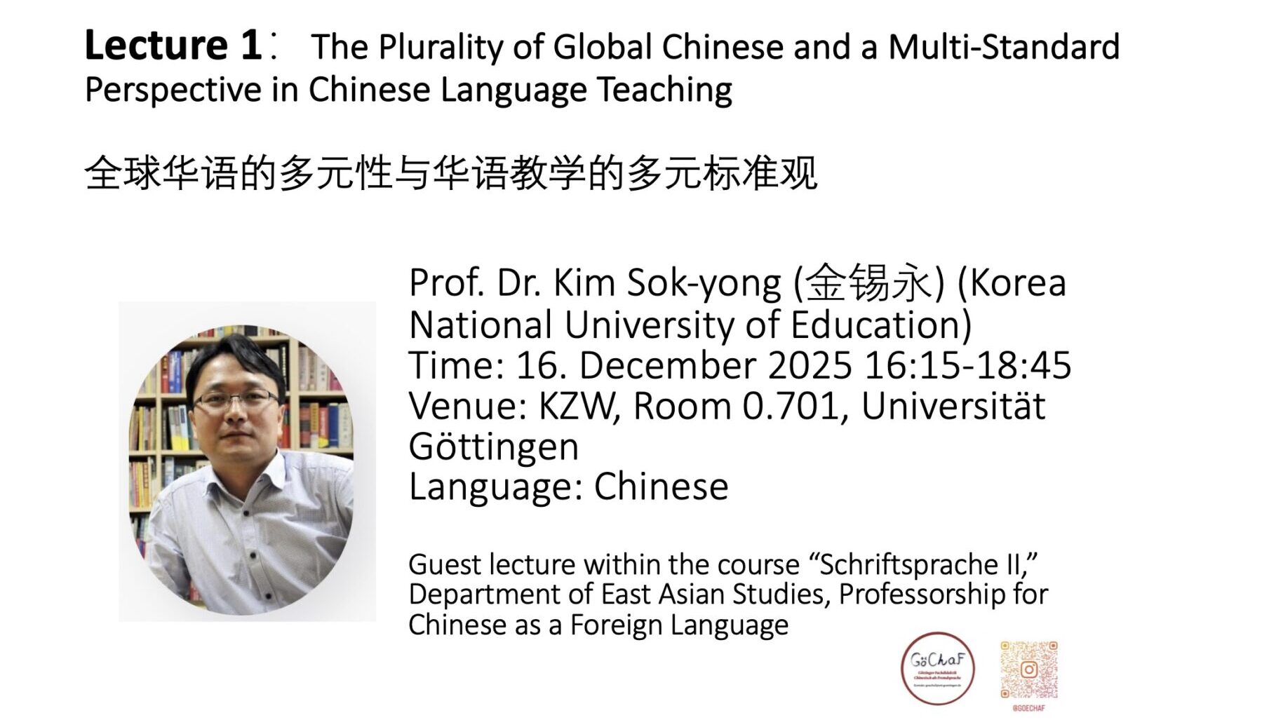 KZW, Room 0.701, Universität, GöttingenThe Plurality of Global Chinese and a Multi-Standard Perspective in Chinese Language Teaching 全球华语的多元性与华语教学的多元标准观 Prof. Dr. Kim Sok-yong (⾦锡永) (Korea National University of Education) Time: 16. December 2025 16:15-18:45 …