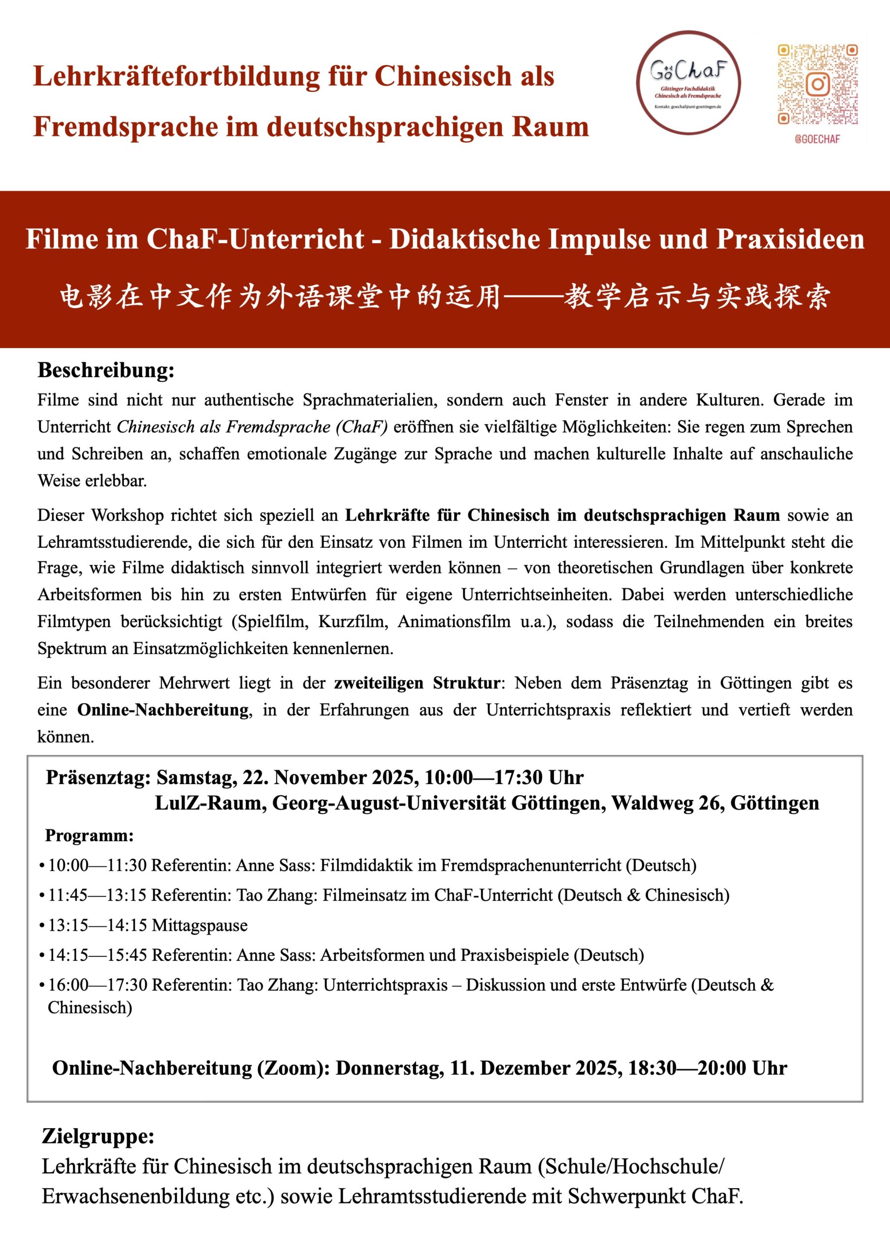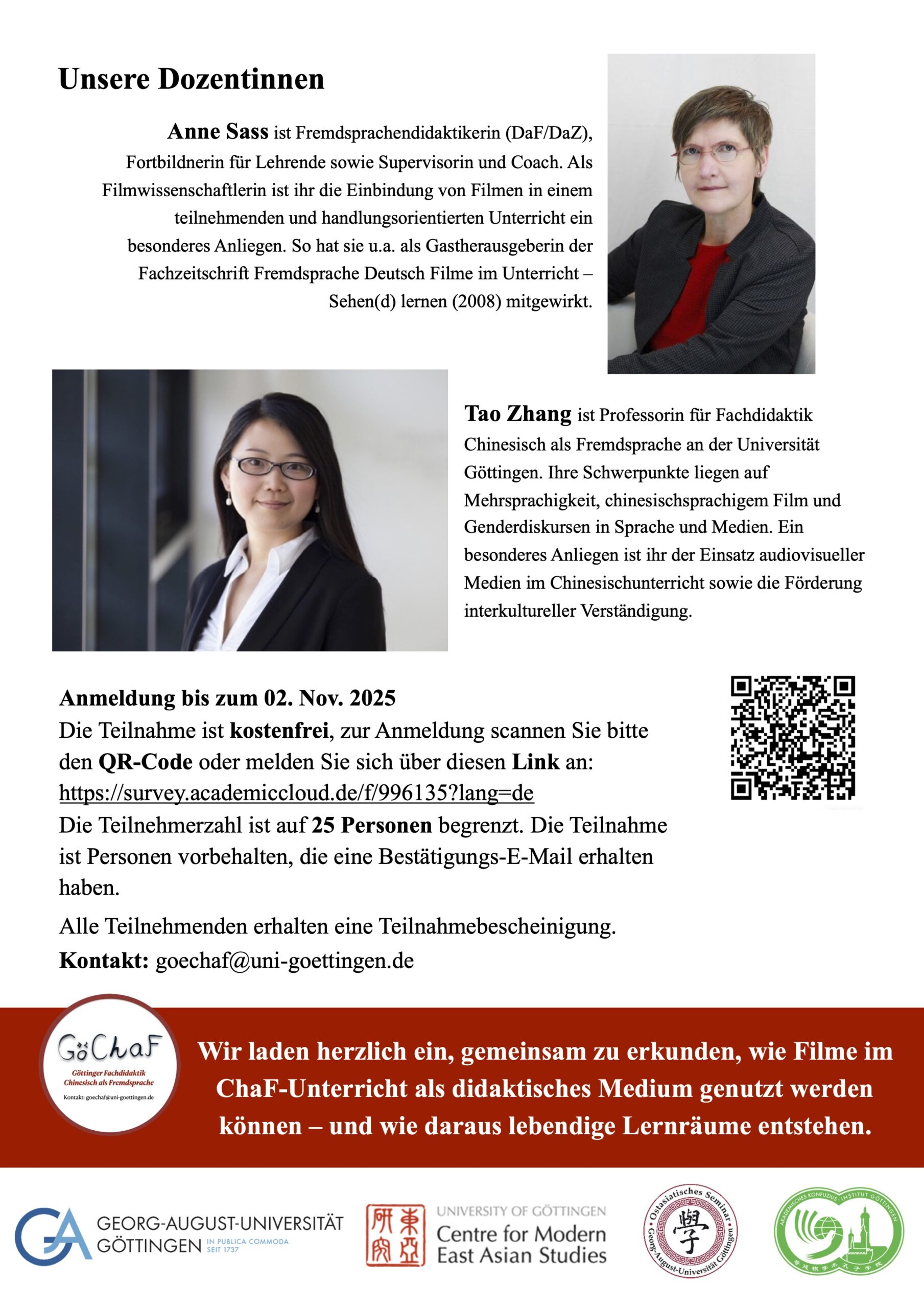 Im Rahmen der Chinesischsprachigen Filmwochen Göttingen 2025 möchten wir herzlich zur folgenden Lehrkräftefortbildung einladen: